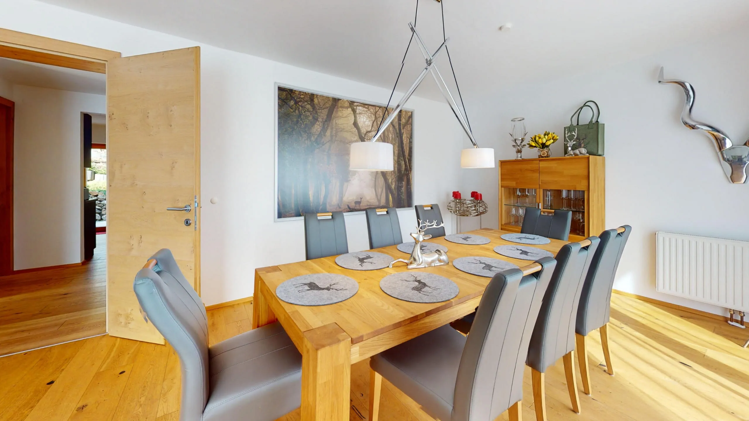 Das Haus mit 215qm ist vollständig neu renoviert und eingerichtet , verteilt über zwei Etagen und verfügt über 6 Schlafzimmer, 3 moderne Badezimmer, 2 Küchen und ein gemütliches großes Wohnzimmer mit Kachelofen.